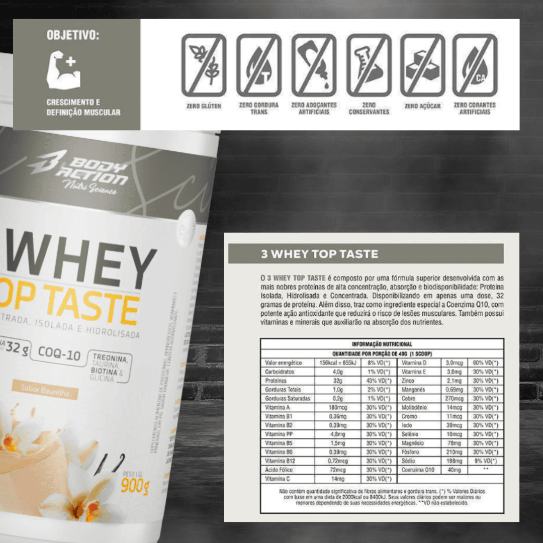 O 3 Whey Top Taste Bodyaction combina as melhores proteínas: Isolada, Hidrolisada e Concentrada. Com 32g de proteína por dose e Coenzima Q10, oferece máxima recuperação muscular, suporte antioxidante e sabor incomparável.