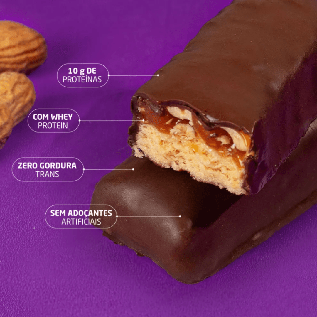 10 g de proteínas; Deliciosa cobertura de chocolate; Recheio de caramelo macio e amendoim crocante; Blend de proteínas de alto valor biológico; Com whey protein; 50% menos carboidratos que um chocolate comum; 78% menos açúcar que um chocolate comum; 0 gordura trans; Sem adoçantes artificiais.